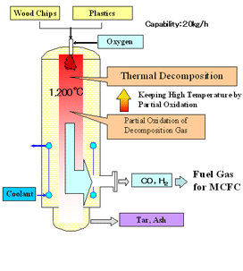 Two molten carbonate fuel cells (250KW MCFC and 250KW MCFC with micro gas-turbine) are introduced to the new energy plant. MCFC has high energy efficiency because it works at 650°C. High temperature exhaust gas can be re-used for energy source of air conditioning. Methane gas coming from the methane fermentation system is fed to one 250KW MCFC. Hydrogen and Carbon mono-oxide gas coming from the high temperature gasifying furnace is fed to another 250KW MCFC with micro gas-turbine.