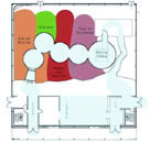 A huge, computer-generated and printed membrane covering a frame in the shape of a high mountain range is stretched to reproduce a natural mountain range inside the pavilion. The interior of the mountains features five large, transparent bubbles that represent thematic sections. Visitors to be admitted to these sections in groups of 15 are provided with talking machines - a remodeled version of the Swiss Army's flashlight. When light is turned on an exhibit, the flashlight gives information by voice in Japanese or English. Walking through dimly lit exhibition areas with a flashlight in hand, visitors will feel as if exploring an unknown world.
