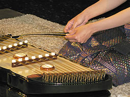 【写真下】木製のバチで弦をたたく