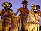 躍動感溢れる面踊り 10人の踊り子が、太陽をあらわす面を使って伝統的な踊りを披露。太鼓の音に合わせて、足で力強いリズムを刻み、時に喚声を上げながら体全体を揺さぶりました。太陽の面は、日本との友情関係をアピールしたもので「ともに日の国として」との思いが込められていました |
