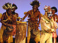 激しく体動かす伝統舞踊 この日のために結成した民族舞踊団「ガボンEXPOキュルチュール」が、ヤシの繊維で作られた衣装に身を包んで登場。喚声を上げながら激しく体を動かす伝統舞踊を披露しました。アフリカの大地を思わせる力強いハーモニーも響き渡りました |