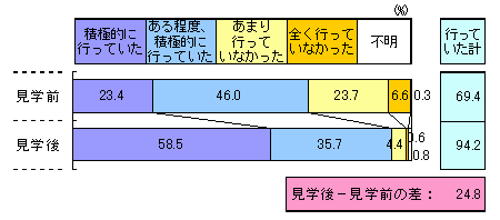 1.でご紹介した見学率上位20施設の見学状況を意識変化の3グループ別に示してみました。どの施設も、明らかに「著しく向上した人」「ある程度向上した人」の割合が「向上しなかった人」に比べて高く、施設の見学が環境意識の形成に強く結びついていることが示されています。