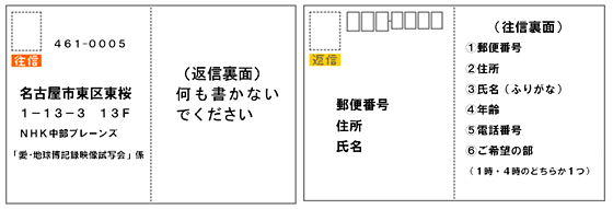 郵便番号、住所、氏名(ふりがな)、年齢、電話番号、希望する部(1時の部か4時の部のいずれか)を記入(返信はがきの表面にも、郵便番号、住所、氏名をご記入下さい)の上、下記宛お送り下さい。